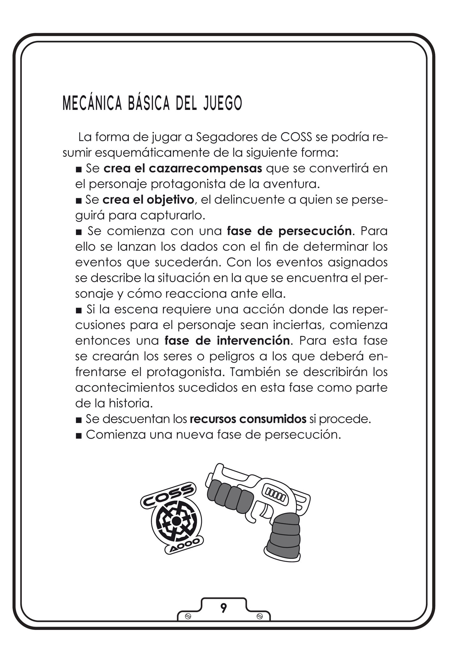 «Segadores de COSS» es un juego de rol en solitario donde asumirás el papel de un cazarrecompensas miembro del Consorcio de Operativos para la Seguridad de Sistemas, la única organización autorizada para la persecución y captura de delincuentes. Tu misión será sencilla: elegir un objetivo, capturarlo y cobrar la recompensa. Pero ten cuidado, el universo es hostil y tus recursos menguantes, así que calcula bien tus pasos.
